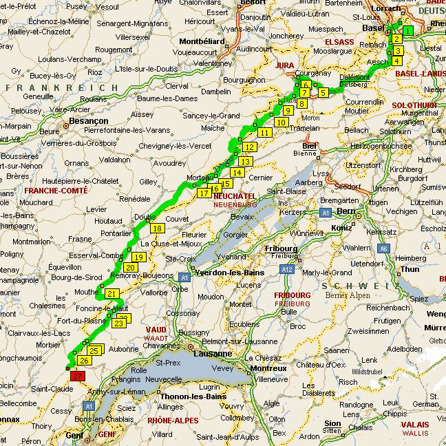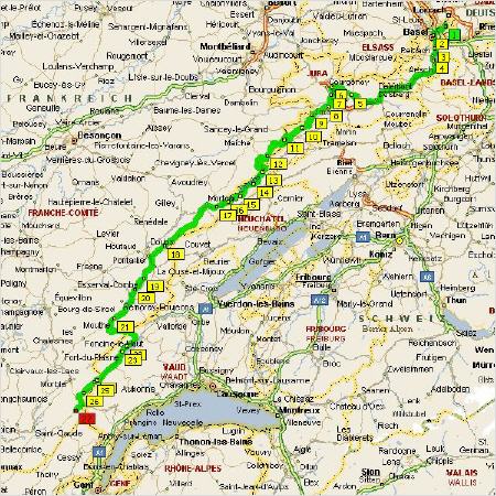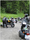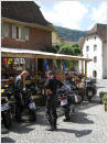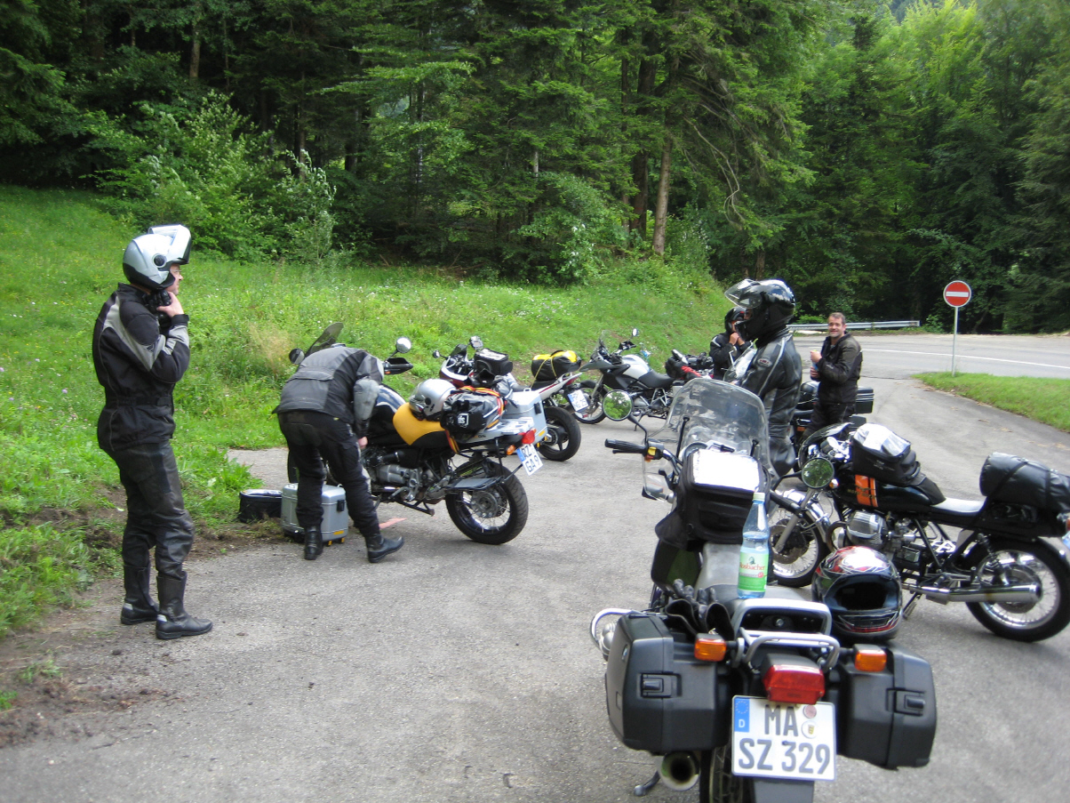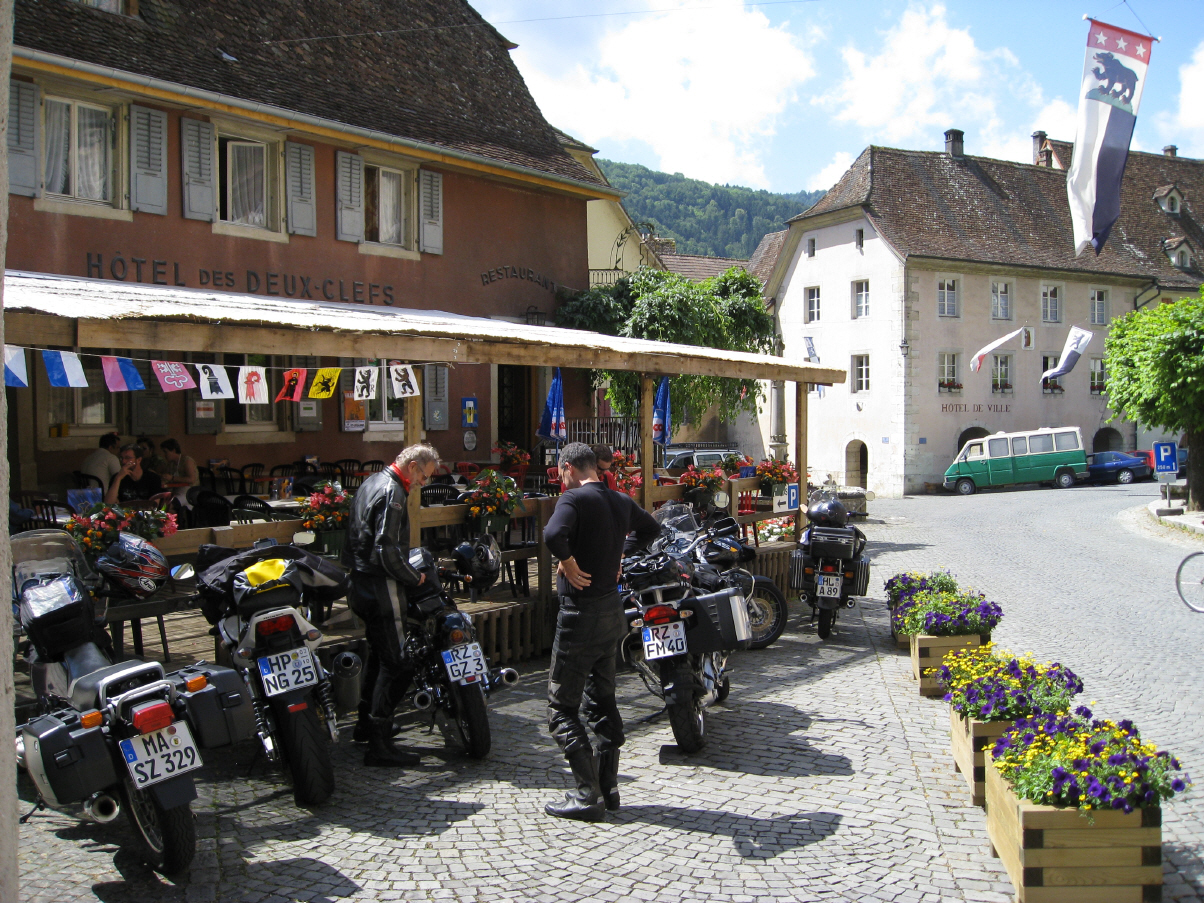 folgte bei einer Schokoriegelpause der erste von zahlreichen, völlig identisch ablaufenden Unfälle im ruhenden Verkehr: ein Motorrad einer hier nicht näher bezeichneten Bayerischen Firma fiel um ... Danach folgte das einsame Jura mit insgesamt 6 Grenzübertritten zwischen der Schweiz und Frankreich (einige aus unserer Gruppe haben den binationalen Tanz wohl gar nicht mitbekommen ...). Im idyllischen St. Ursanne am Fluß Doubs gab es eine nette Eiskaffeepause