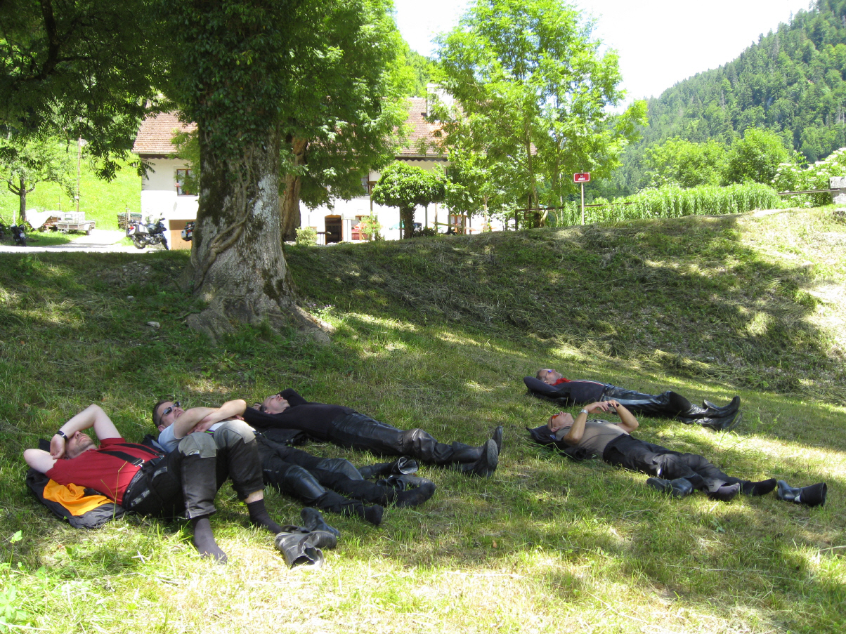 auf dem Dorfplatz. Über die bewaldete Bergstrecke nach Les Enfers glitten wir am französichen Teil des Doubs entlang zum La Rasse (leider inzwischen geschlossen), einem französischen Restaurant auf Schweizer Gebiet mit lecker frischer Forelle - futtern besser als bei Muttern! Anschließend die entspannende Entdeckung der Horizontalen