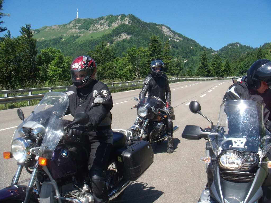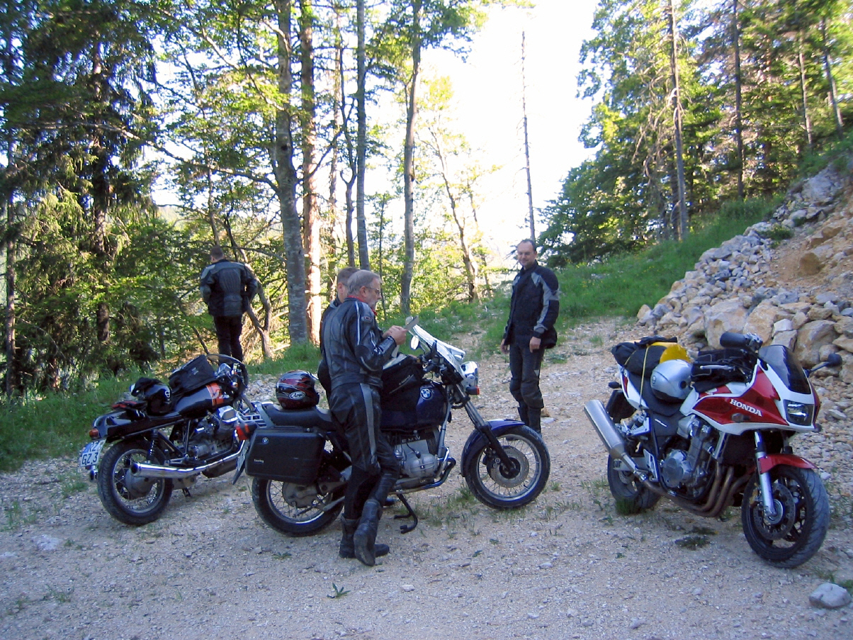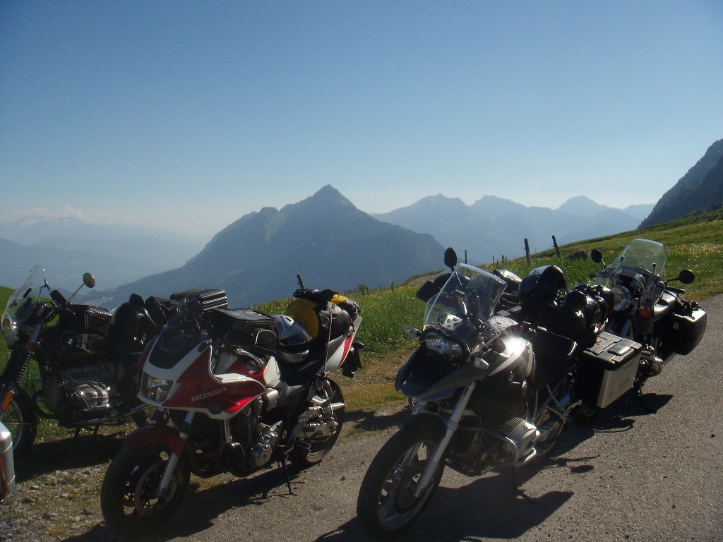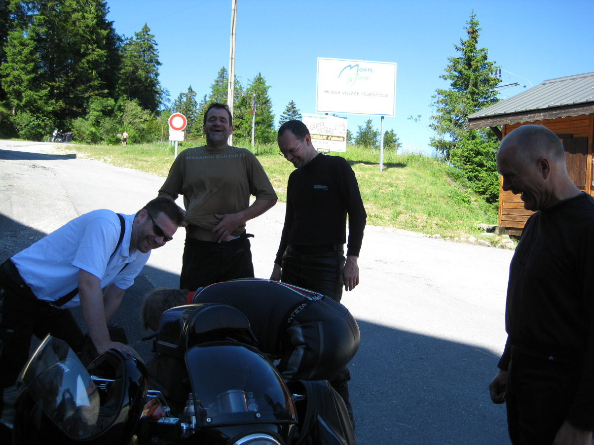 kam es anschließend zu einer weiteren außerplanmäßigen Seitenlage eines anonym bleiben wollenden Co-Bikers (auf den Bildern läßt sich der Unglücksmoment vor der imposanten Alpenkulisse erahnen). Auf kleinen unasphaltierten Waldwegen schlichen wir uns um Genf herum in die französischen Alpen, an Annecy vorbei auf dem herrlichen "Aravis-Höhenweg"