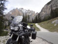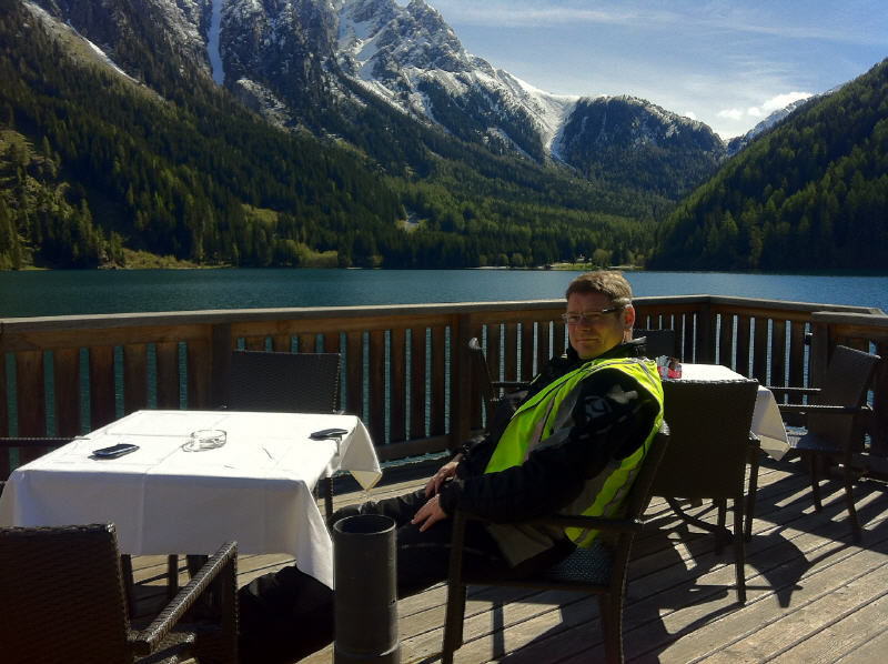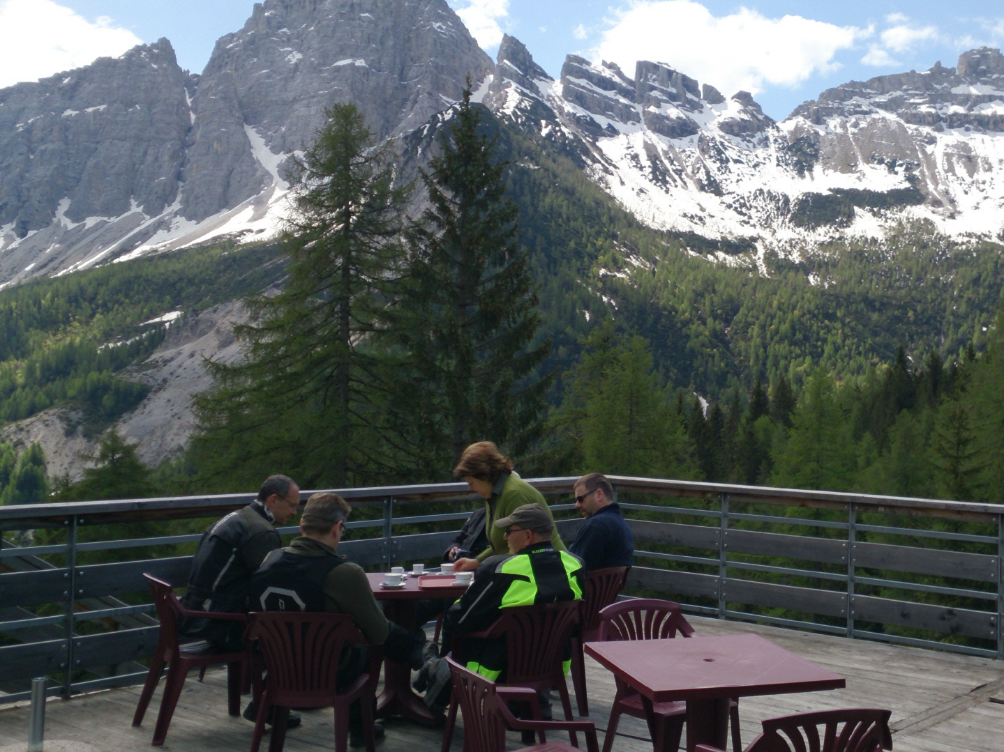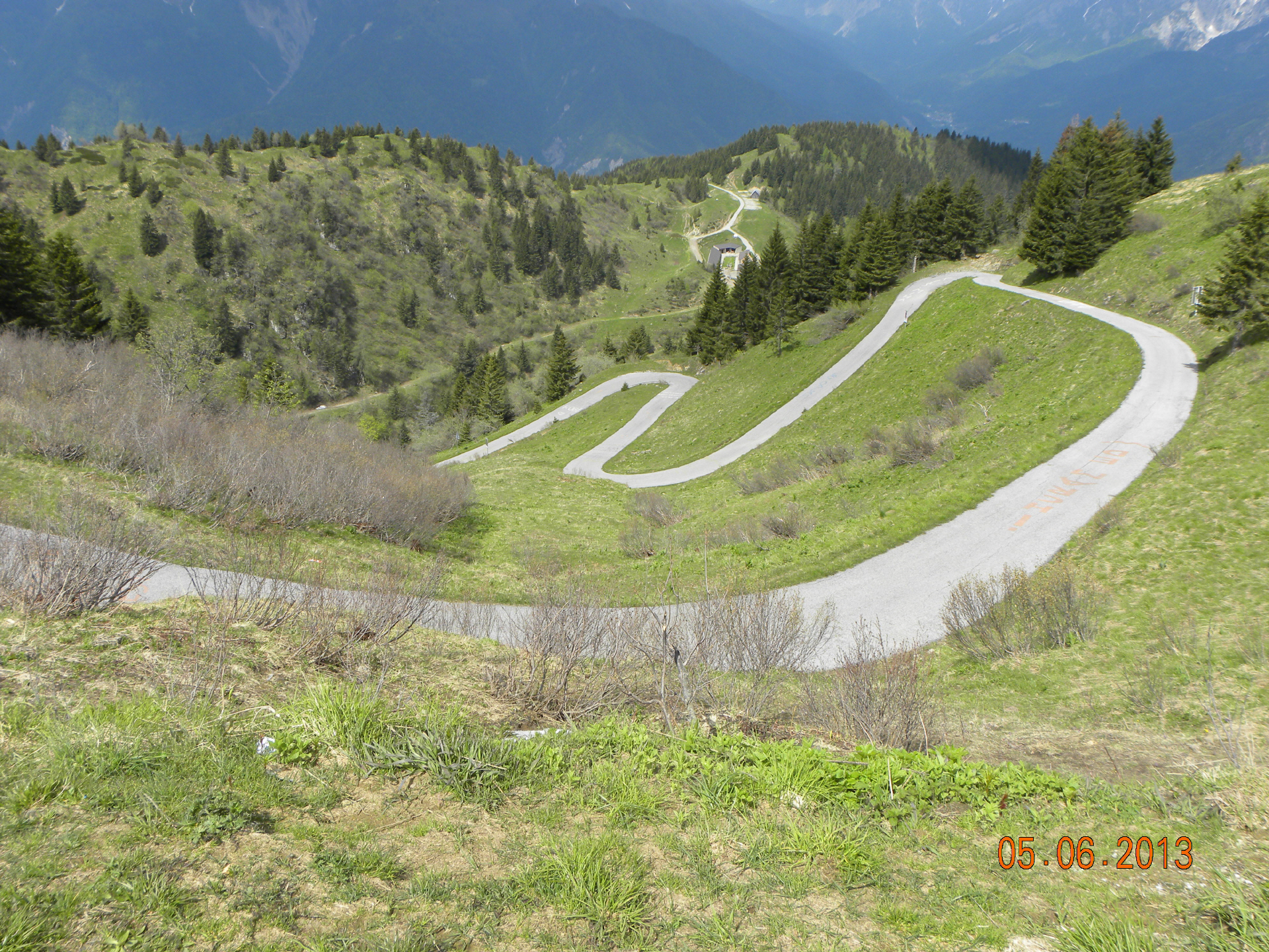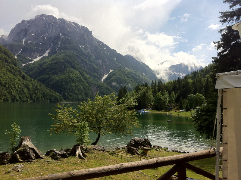 (Lanzenpass – einsame einspurige Bergstraße, zwischen Paularo und Pontebba mit den klassischen italienienischen Hindernissen: über die Straße hängende Drahtseile von Waldarbeitern, umfahrbare Streckensperrungen, Schafherden -> s. ). Auch die folgende 30-km-„Klinke“ über die Sella Cereschiatis und die Sella Nevea war landschaftlich traumhaft einsam, das Wetter stabil und so gelangten wir rechtzeitig zur Cappuccinozeit an den kitschig-türkisfarbenen Lago del Predil