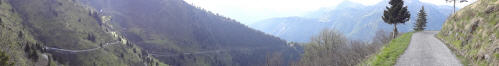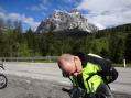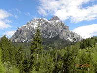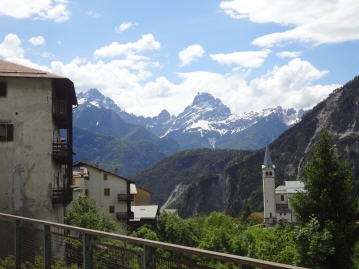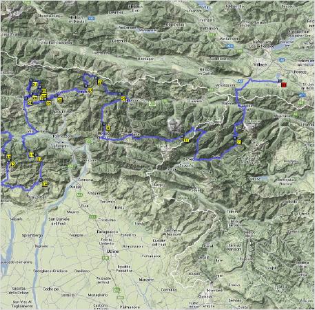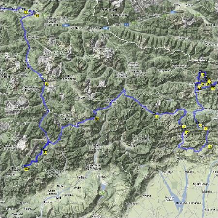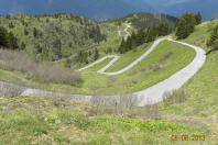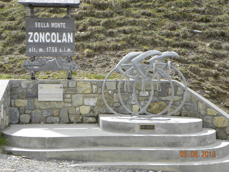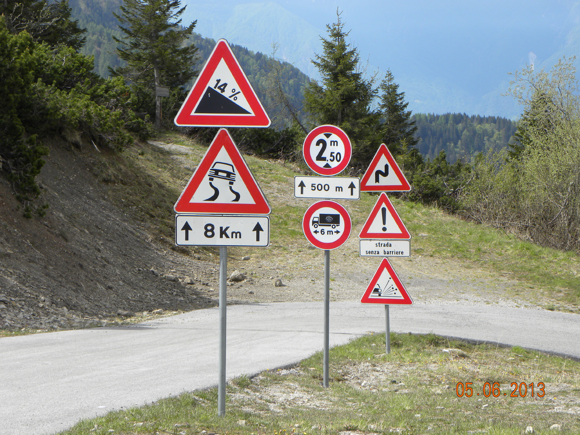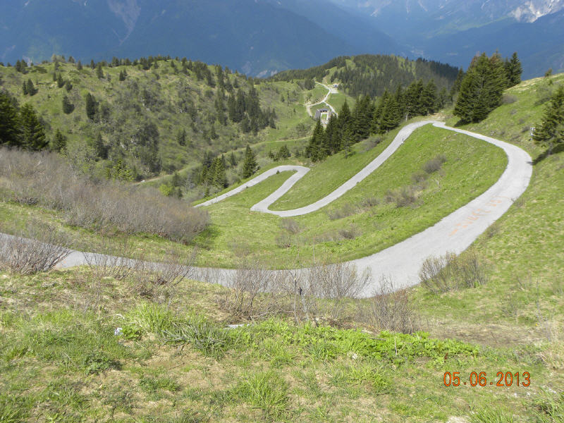 Am nächsten Morgen wechselten wir bei kühlem, aber sonnig-wolkigem Wetter vom Cismon- in das Cordevoletal (jeweils südliche abfließende Dolomitenflüsse) mit Überquerung des Passo di Cereda und der Forcella Aurine. Nach diesen ersten 33 km folgte hinter Agordo der Passo Duran. Die Forcella Cibiana führte uns ins Cadore, eine Tallandschaft, aus der die meisten Eisdielenbesitzer in Deutschland kommen. Am Fuß der Sella Ciampigotto auf dem Weg zum Lago di Sauris überraschte uns der Hinweis auf eine Sperrung. Also ging es ein Tal weiter südlich über den Passo della Máuria und die Sella di Cima Corso nach Ampezzo. Hier nahmen wir den zahmen Priuso-Sattel und die Forcella di Monte Rest (Asphaltlindwurm!) unter die Räder und genossen nach dem Wechsel in das Arzino-Tal die einsame Sella Chianzutàn. Hier hatten wir mal wieder mit einer typisch alpinen Verkehrsbehinderung zu kämpfen: eine Schafherde in unserer Richtung - überholen unmöglich. Durch das Tal des Degano erreichen wir schließlich am Monte Zoncolan das "Hotel La Perla" für unser 2. Nachtlager. Fast wären wir im falschen Hotel abgestiegen, irgendwie hatte sich der Wegpunkt eines Alternativhotels bis zuletzt in der Naviroute festsetzen können.