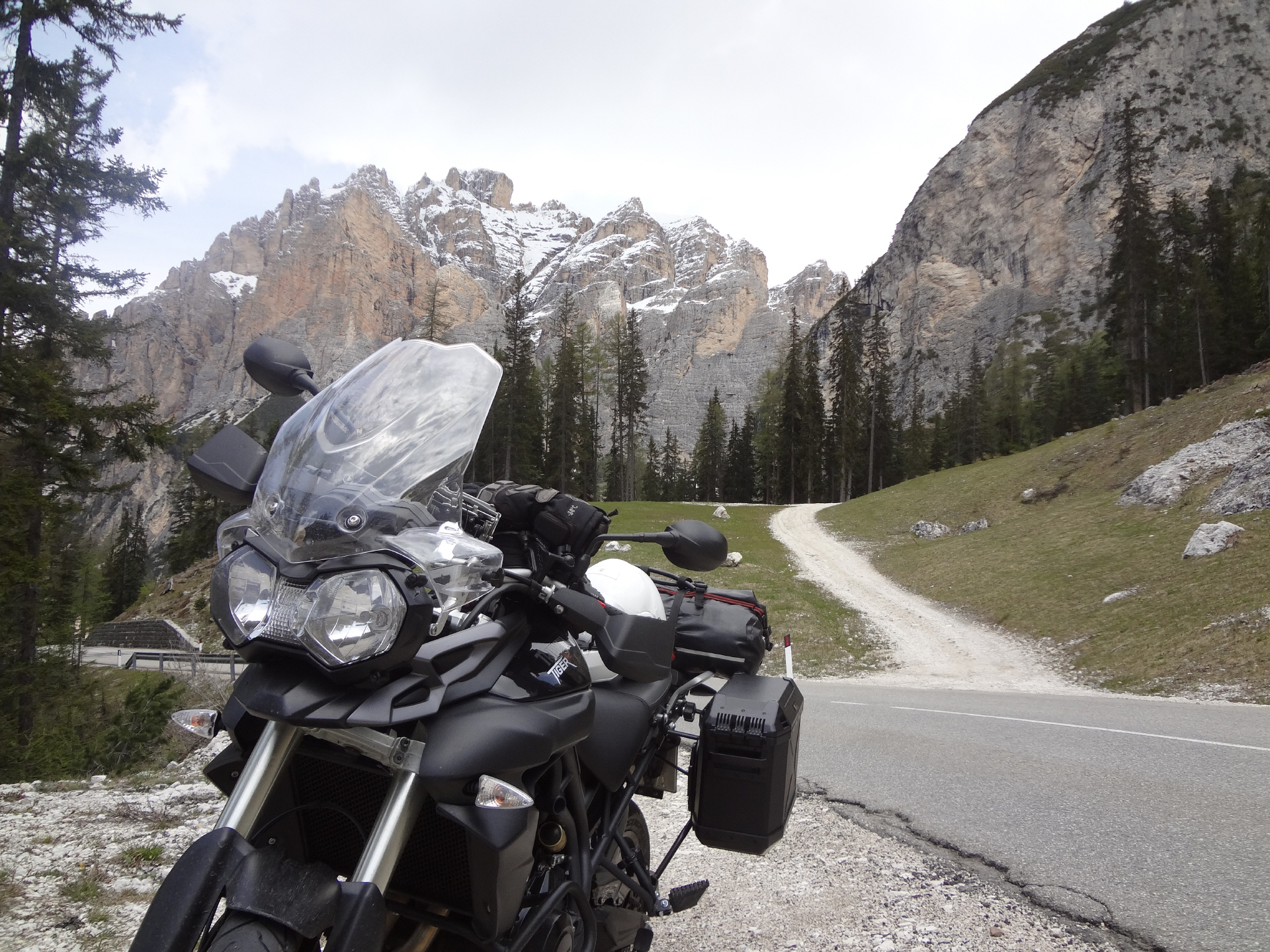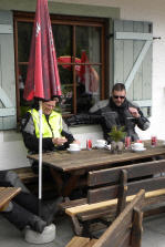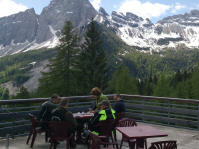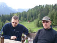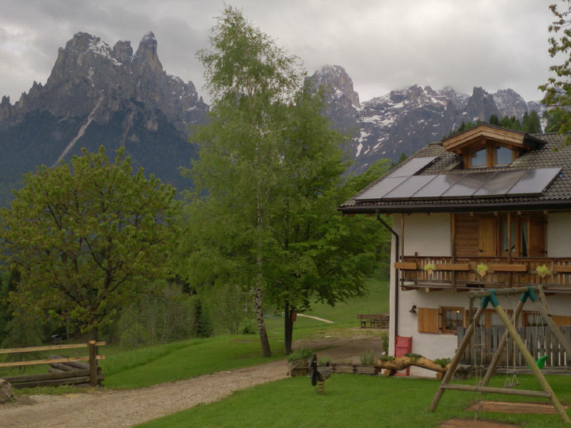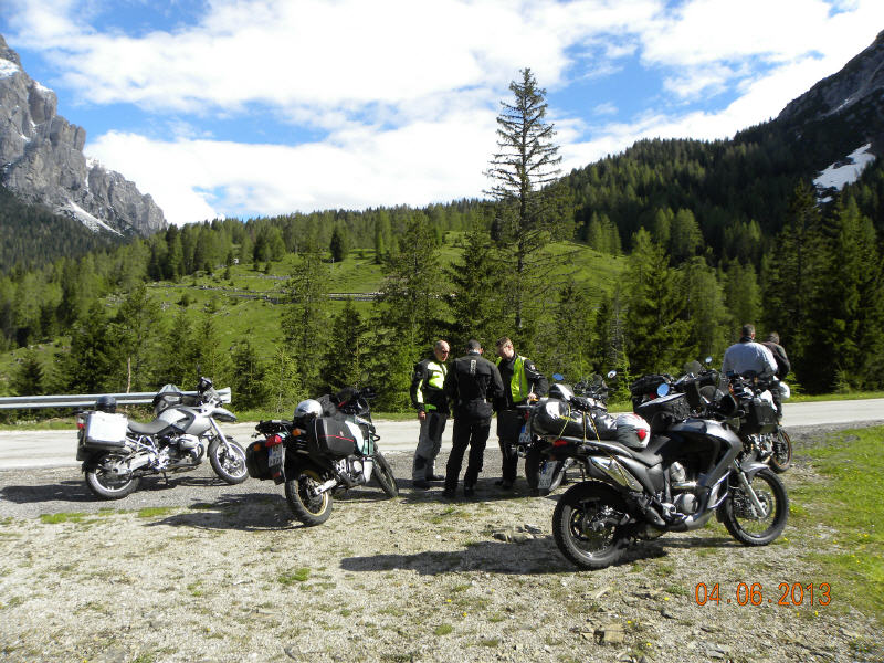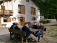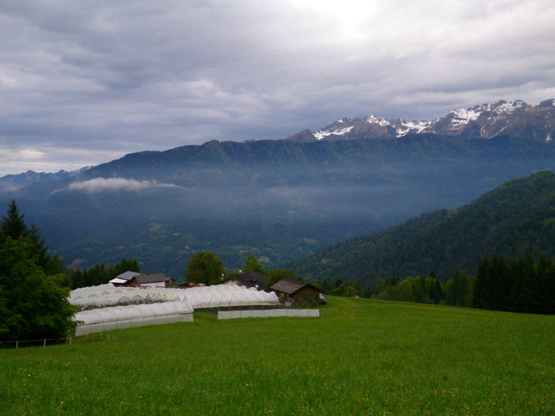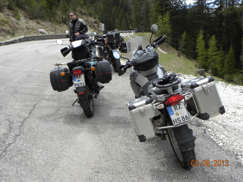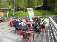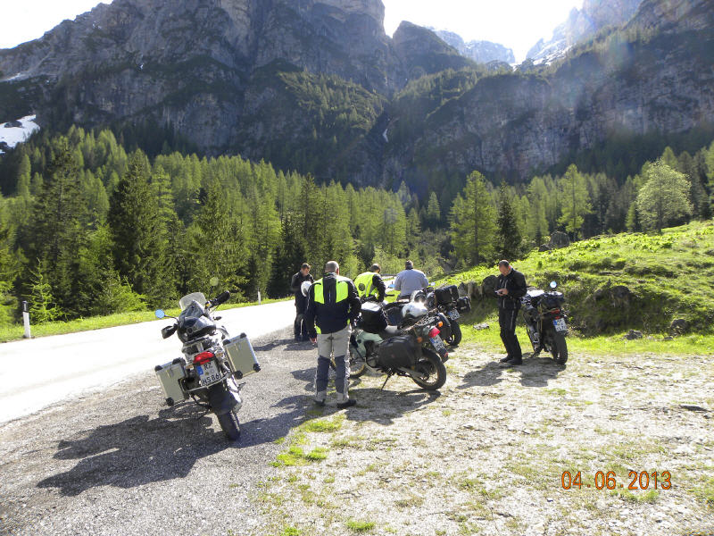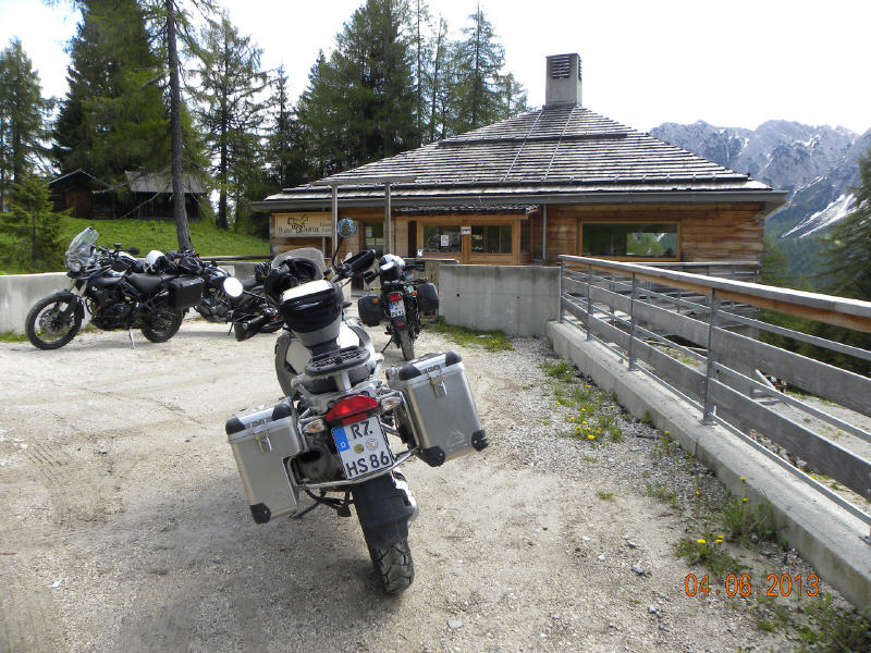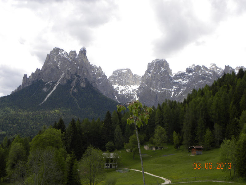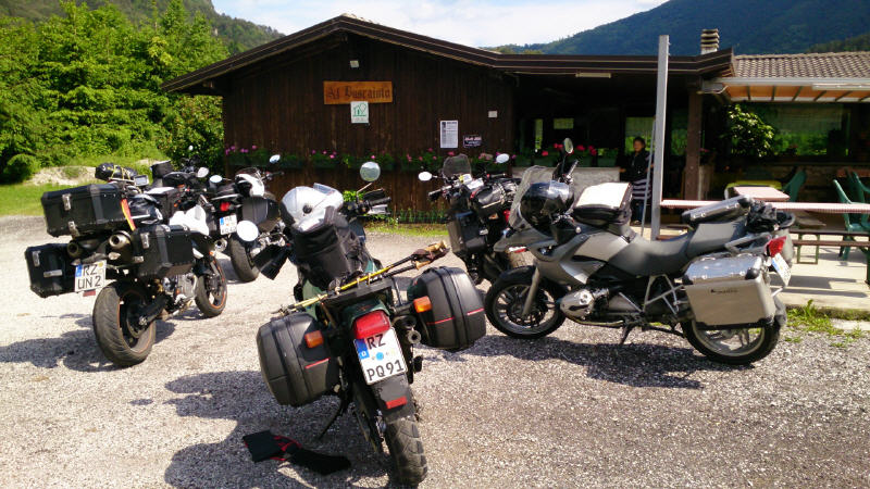 Wir hatte uns mit salami-käse-weinvollen Mägen gerade im Autozug bequem gemacht, als die Durchsage kam, dass aufgrund der Hochwassersituation in Österreich bereits in München statt Bozen Endstation ist. Bereits gegen 01.00 Uhr waren wir wohl in München, wurden aber erst um 6.00 Uhr zu unseren verzurrten Schätzchen gelassen. Angenehm früh gegen 7.00 Uhr kamen wir los und erreichten bei ungemütlich nasskaltem Wetter kurz vor Mittag den Brenner. Unmittelbar mit den ersten italienischen Verkehrsschildern riss die Wolkendecke auf und die Fahrt nach Bruneck im Pustertal war wunderbar. Auf dem zentralen Platz trafen wir unsere Mitfahrer Kai und Matthias. Dann ging es quer durch die Dolomiten an deren südlichen Rand nach Tonadico im Cismontal. Abseits der Landstraße zum Cereda-Pass fanden wir über einen kleinen Schotterweg den familiären Bauernhof "Agritur Dalaip Dei Pape". Zunächst genossen wir ein kühles Bier auf der Panoramaterrasse und schauten uns auf dem Hof um: neben ausgedehnten Beerenplantagen gab es auch essbare Fauna incl. 2 Bisons ! Ein vorzügliches Abendessen (wunderbare Pastavariation mit anschließendem Käse-Wurst-Fruchtsoßenteller ...) schloss den ersten leicht unplanmäßigen ersten Tag erfolgreich ab.
