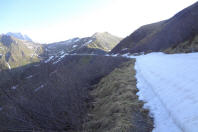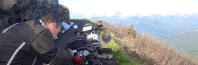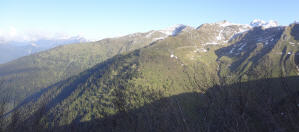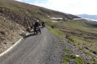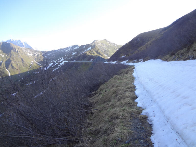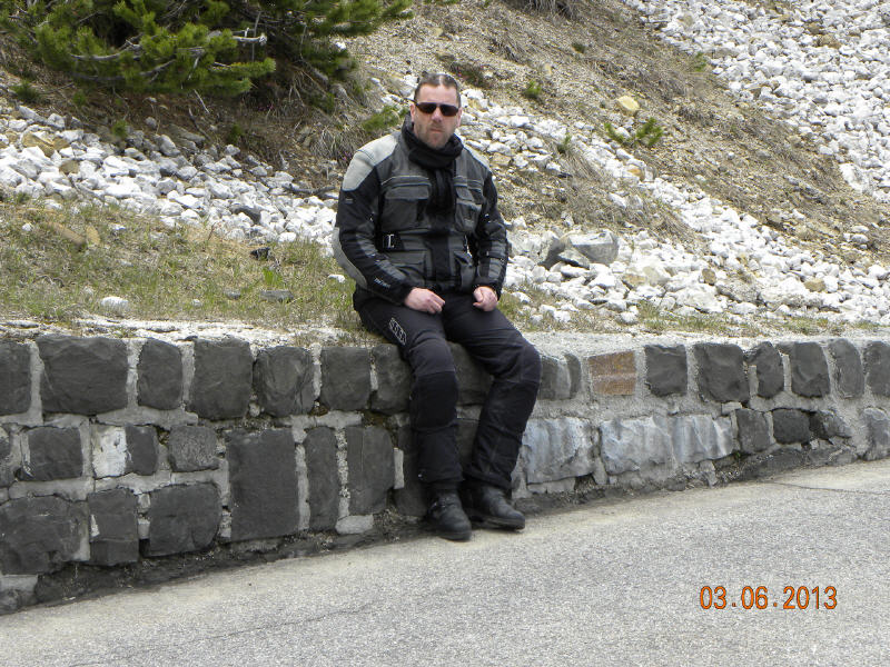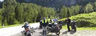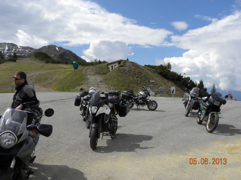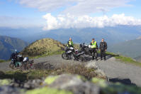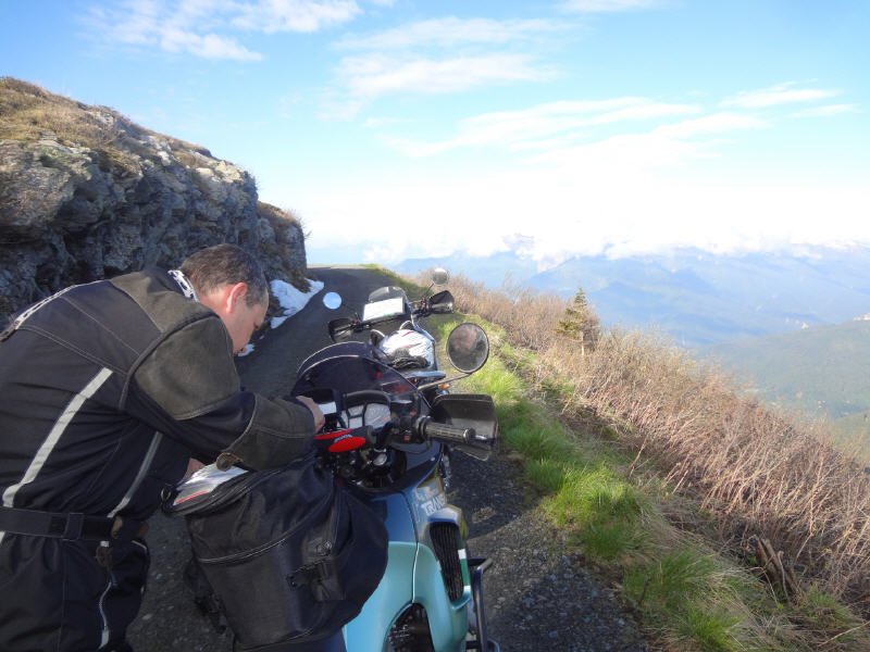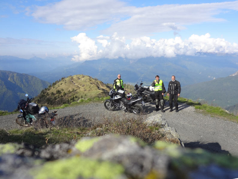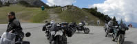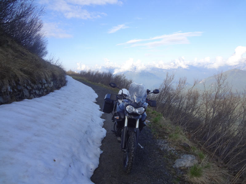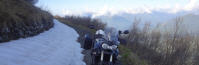 In der aufgehenden Morgensonne erklommen wir in freiwillig-reduzierter Gruppengröße die Panoramica delle Vette, eigentlich vergleichbar mit der Assietta-Kammstraße, aber nicht so lang und nur im flach verlaufenden Mittelteil Autobahnschotter. Leider war oben auf der Höhenverbindung aufgrund ausgedehnter Schneefelder ein Weiterkommen unmöglich (Motorrad-Evakuierung). Trotzdem ein unvergessliches Panorama