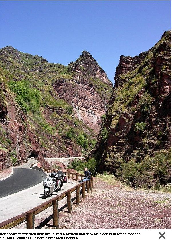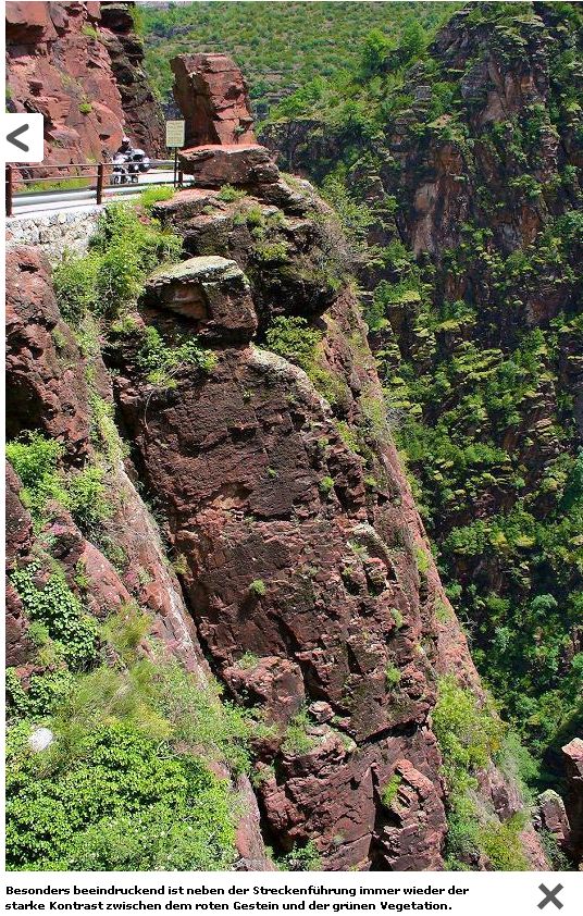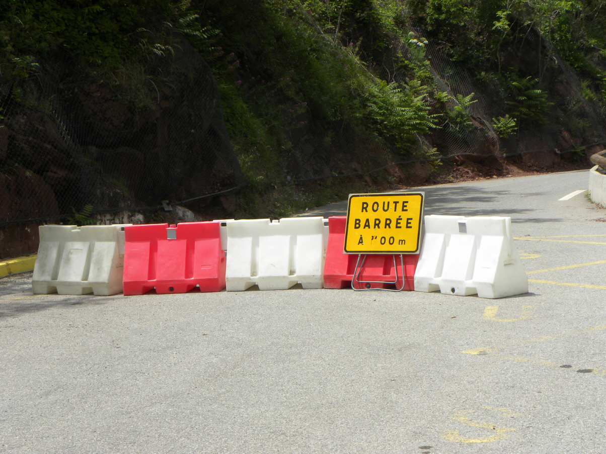 , gefolgt von den kurvenreichen, aber leicht regnerischen Col de la Couillole und dem Col de Valberg (wieder so ein französicher Wintersport-Retortenort). Abwechslungsreich war die enge Schlucht Gorges du Bachelard (roter Schiefer mit roh durch den Fels gehauenen Tunneln, leider nur videomäßig dokumentiert). Anschließend genossen wir die abgeschiedenen einspurigen Wege über Col de Félines, den Col de Trébuchet und den Col de St.-Raphael. Am Anfang der Ciansschluchten stand ein unmißverständliches Sperrschild