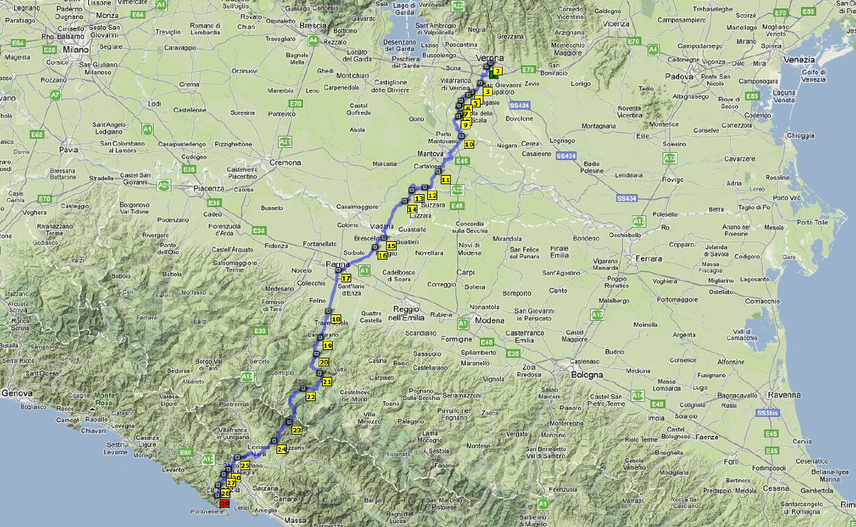 Am 18.06. haben wir uns am frühen Nachmittag in der verkehrsberuhigten Innenstadt von Parma auf mehr oder weniger ordnungswidrigen Wegen getroffen. Danach ging es durch die landwirtschaftlich dominierte Poebene und den Appenin nach La Spezia.