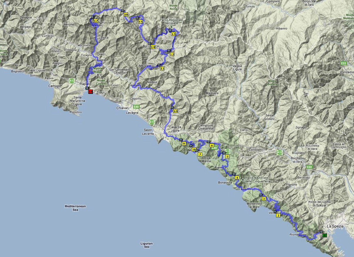 , eine 12 km lange Bergkette an der Riviera levante mit 5 Dörfern (Weltkulturerbe: Riomaggiore, Manarola, Corniglia, Vernazza und Monterosso al Mare). Herrliche Kurven auf einspurigen Wegen, immer wieder mit grandiosem Blick auf die steil ins Meer abfallende Küste. Zwischen Sestri Levante und Rapallo
