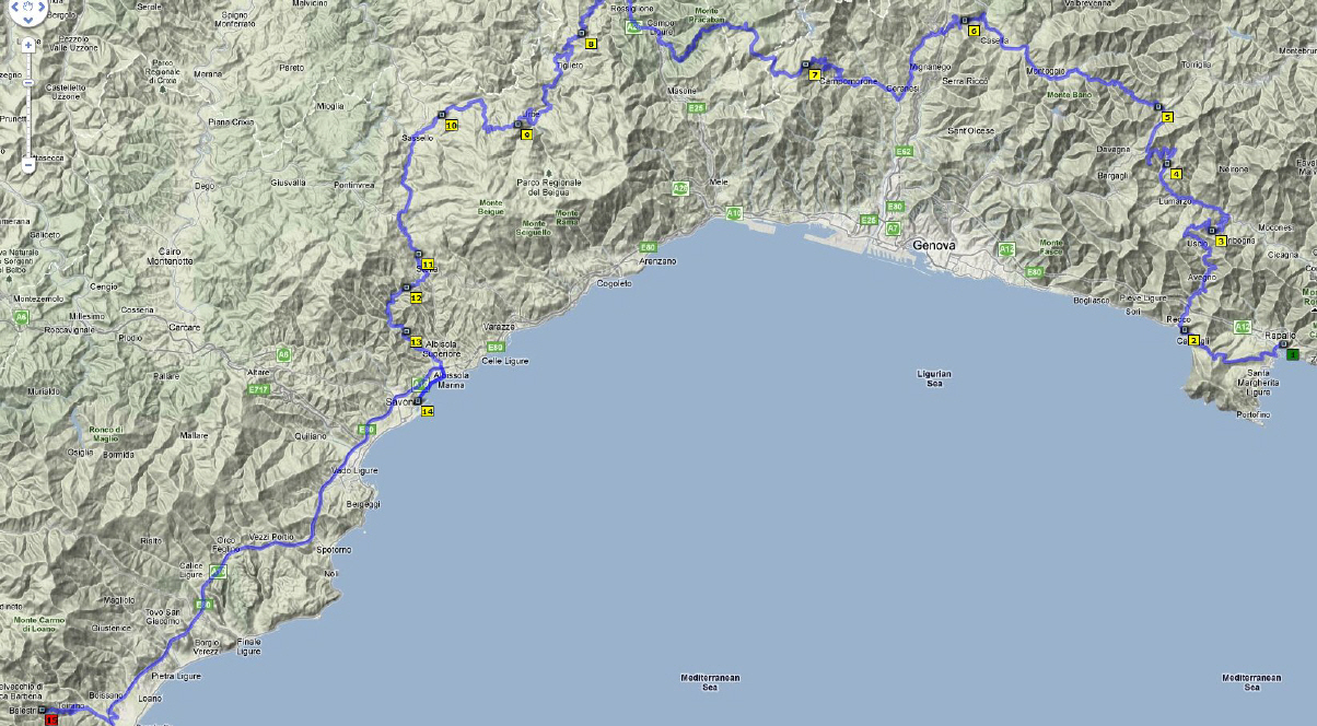 am Ligurischen Höhenweg an. Aufgrund des zähen Verkehrs auf der Via Aurelia und der vorgerückten Stunde haben wir von Albissola bis Borghetto Santo Spirito die Autobahn benutzt.