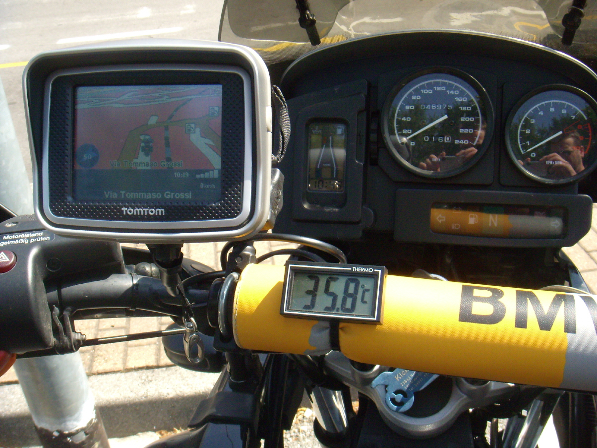 Um die Mittagszeit bei knackigen Temperaturen über 30 Grad führte uns die Tour nochmals mit der Fähre über den Comer See in die Berge bis nahe am Luganer See. Mitten in den Bergen zickte Svens Mopped mit furchtbaren Anlassergeräuschen. Mit vereinten veterinär-maschinenbau-hobbyschrauber-technischen Kräften konnte der Fehler gefunden werden: der Anlasserknopf am Lenker war defekt. Mit vorhandenen Bordteilen ermöglichte eine Überbrückung des Anlassers eine problemlose Weiterfahrt, allerdings bei ständig laufendem Motor auch während der (Tank-) Pausen. In der Gluthitze