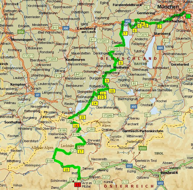 Zum "Einrollen" ging es zu Viert (Sven, Manfred, Fred und Hartmut) zunächst Richtung Ammersee. In Peiting gab es die große regennasse Vereinigung mit Kai und Matthias. Bei trockenem Himmel fuhren wir an den bayerischen Königsschlösssern vorbei Richtung Fernpass. Rechts ab ging es über den Berwanger und Kelmer Sattel ins idyllische Namloser Tal