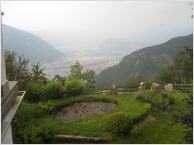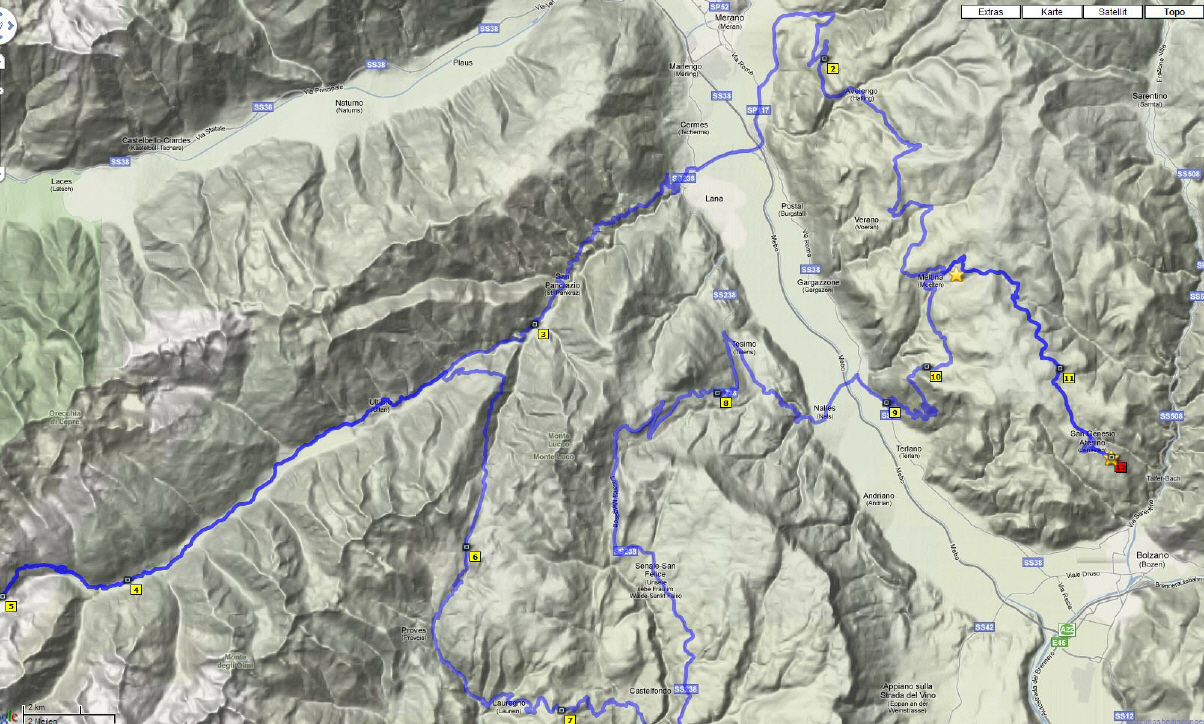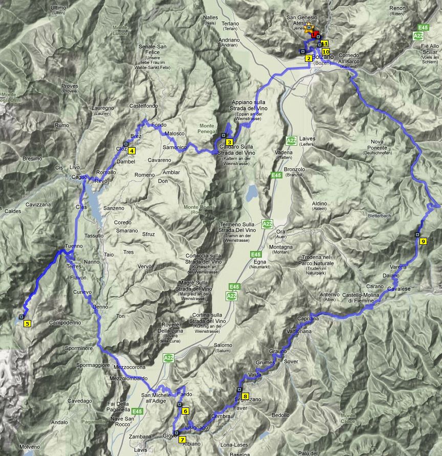 Nach der Abfahrt vom Bahnhof in Bozen am Montag, den 07.06.2010 ging es steil hinauf nach Jenesien, wo wir unser Hotel "Schönblick/Belvedere" in Beschlag nahmen und die am Vorabend angekommenen Lutz, Matthias und Kai in unsere Arme schließen konnten. Anschließend führte die Tour an der östlichen Seite des Saltner Höhenrückens über das Bergdorf Flaas und den Schermoos-Sattel auf Nebensträßchen hinunter nach Meran. Am Ende des wildromatischen Ultentals genossen wir den ersten kulinarischen Höhepunkt in der Knödelhütte am Weissbrunner See: unglaubliche leckere Knödel!. Danach ging es über den Hofmahdsattel ins Nocetal, in dem wir nach links über das Brezer Joch nach Fondo gelangten. Das Gampenjoch stellte die Verbindung zum Etschtal her, an dessen Nordostrand wir über einen kleinen Bergweg zurück nach Jenesien in unser Hotel kamen.