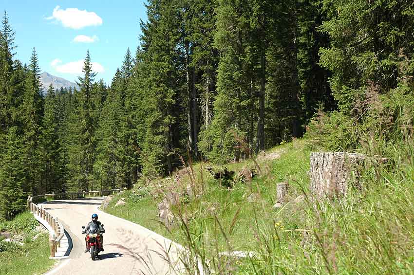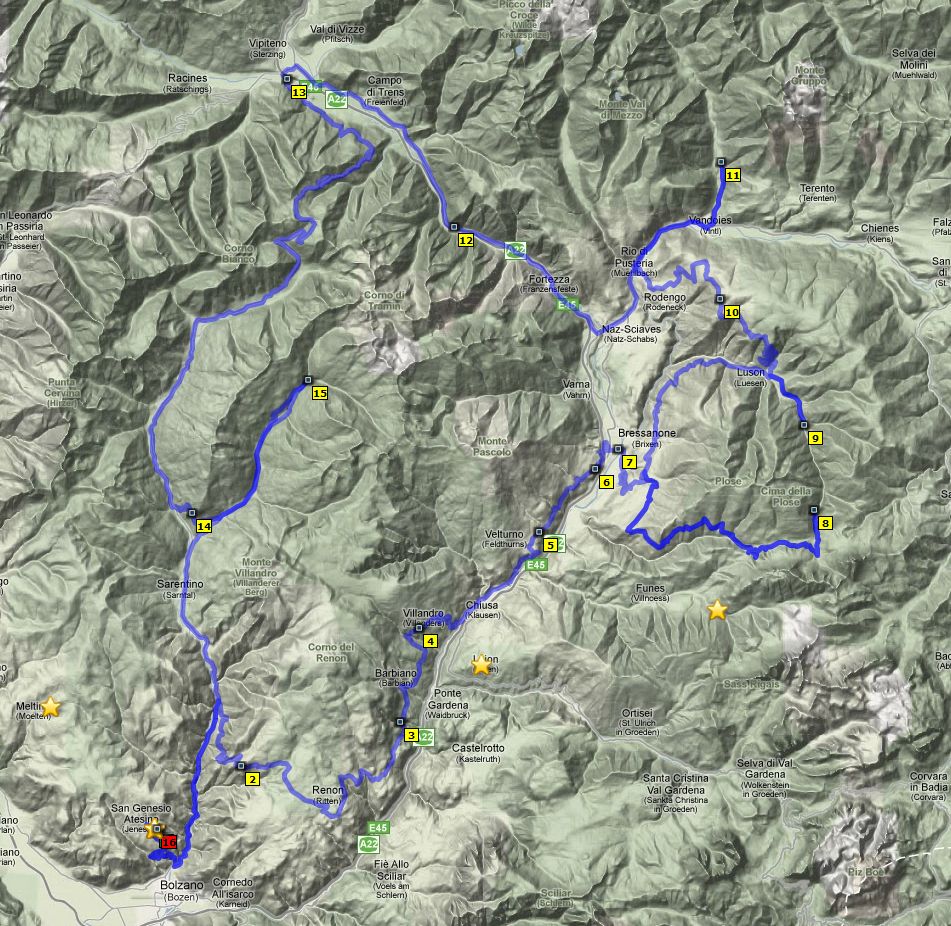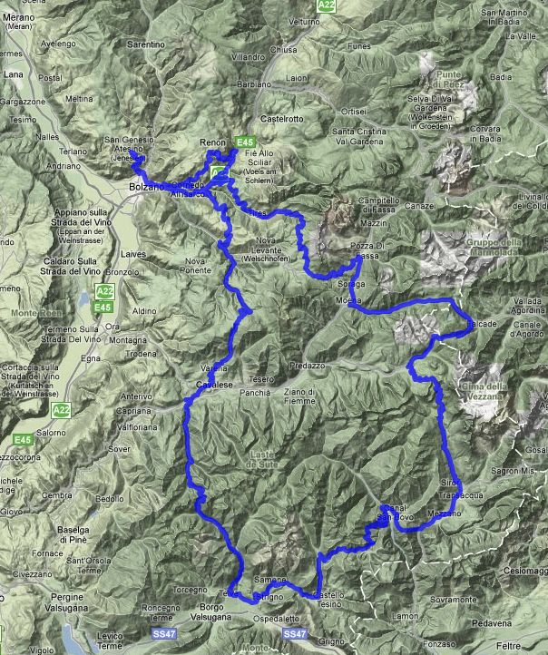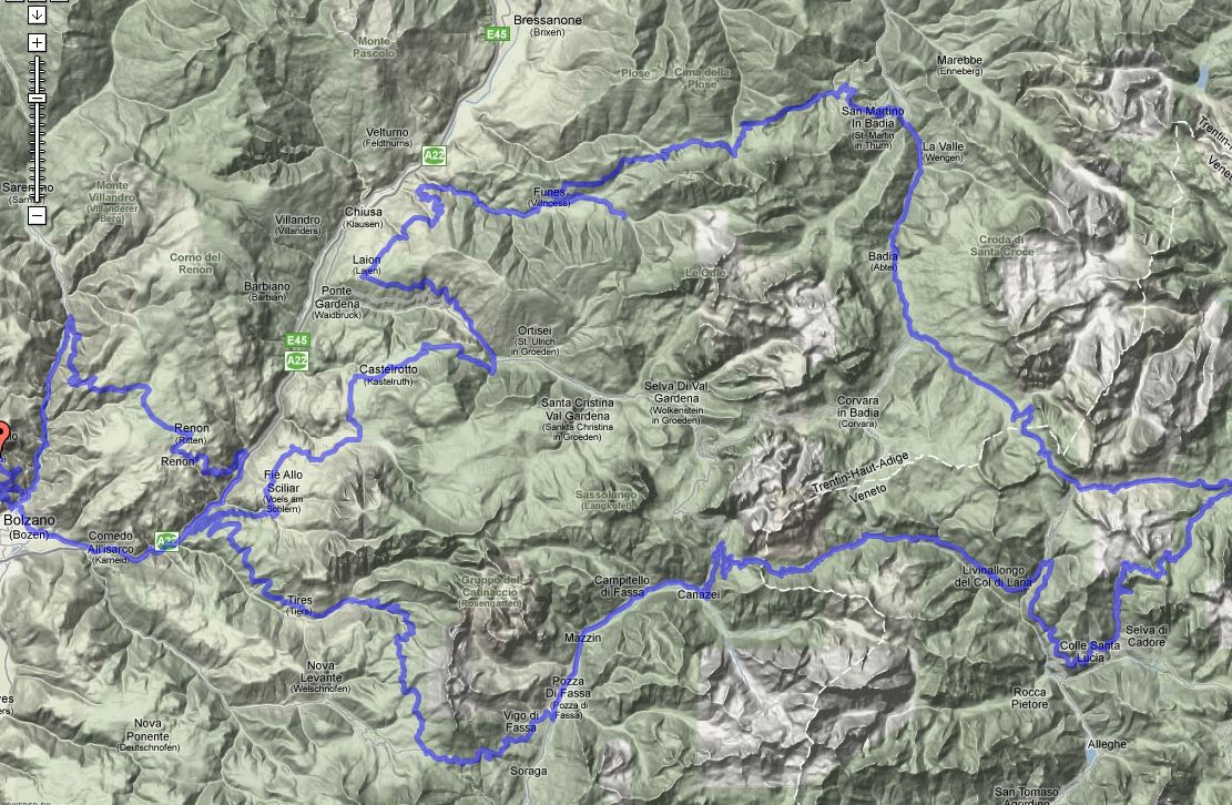 Die Tour führte uns abseits der Haupt-Touristenrouten durch die südlichen Dolomiten und über meinen Lieblingspass, den Passo Manghen. Zunächst fuhren wir über den Ostrand des Ritten hinunter ins Eisacktal, danach über die neue Höhenstraße nach Tiers. Weiter ging es über den Nigerpass und die Rosengartenstraße zum Karerpass auf der "Großen Dolomitenstraße". Nach der Abfahrt in das Fassatal erreichten wir in östlicher Richtung über den Passo di San Pellegrino und den Passo di Valles